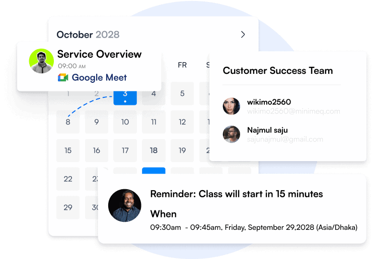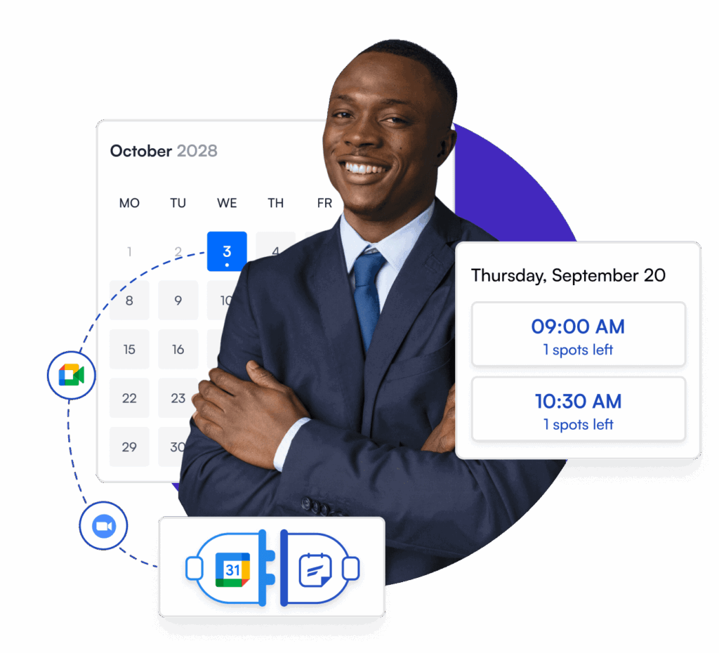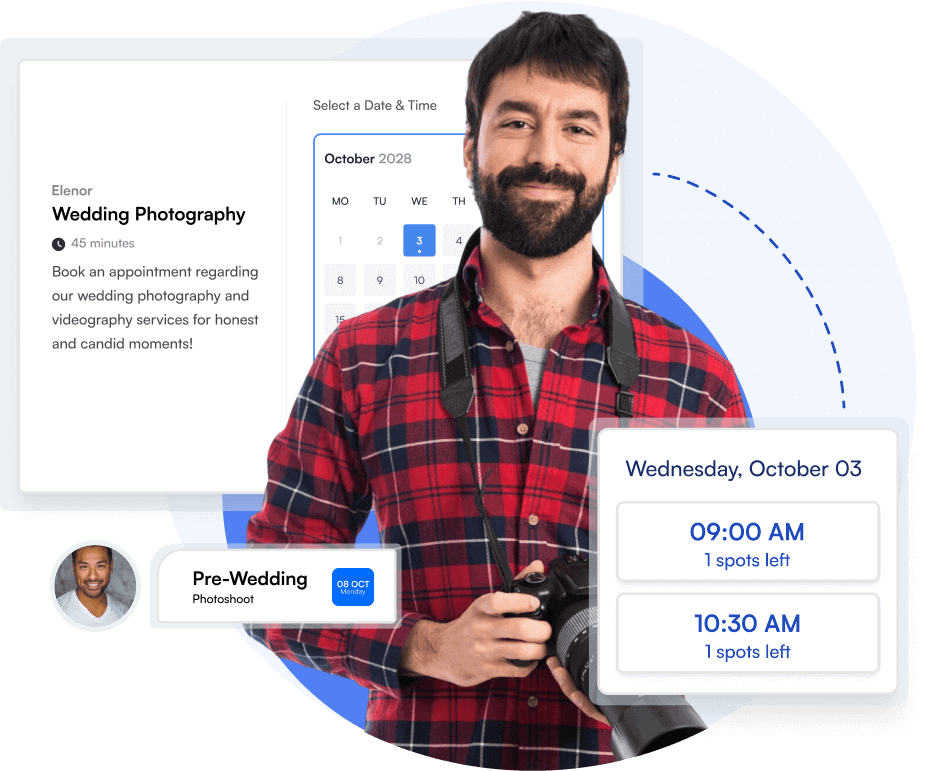 Let clients book appointments with you while you focus on what matters most —providing them with an unforgettable service! Streamline client appointments Enjoy the convenience of an updated calendar Sell personal service appointments Sync client data with your CRM Automate appointment reminders and follow-ups.