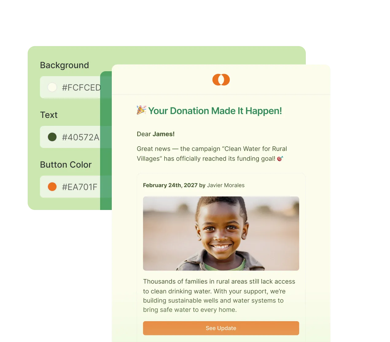 Let donors share their thoughts, encouragement, and experiences directly on your campaign page. Enable comments for each campaign, interact with supporters in real time, and create a connected community.