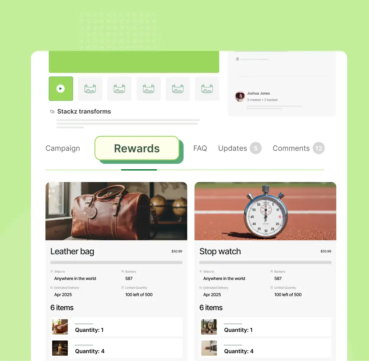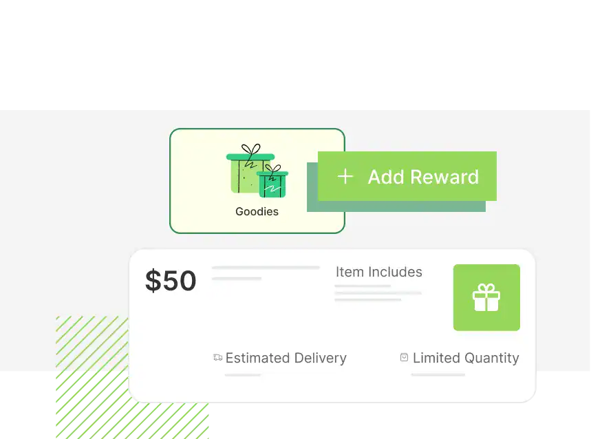 Offer exciting rewards to motivate your backers and boost pledges. You can limit quantities, set delivery dates, and include digital or physical rewards.