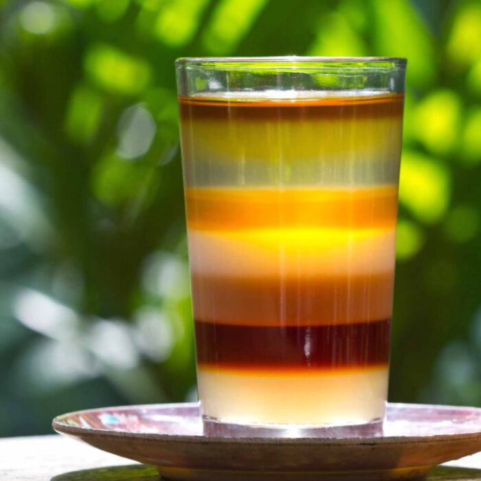 Divide the palm sugar syrup into two tall glasses as your first layer, then add a cup of ice to each glass, until they're filled to the top. Pour the evaporated milk into each glass for the second layer, until around 2/3 full. Finally, pour the final layer of black tea to the top of each glass.