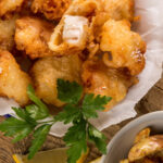 Dust the cod cheeks in flour, dip into the batter and fry until golden. This will take 2-3 minutes, depending on the size of your cod cheeks. Transfer to a plate lined with kitchen paper to drain.